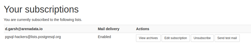 Общение в сообществе PostgreSQL осуществляется через рассылки, а чтобы подписаться на них, требуется учетка на www.postgresql.org. Для ее создания надо перейти по ссылке https://www.postgresql.org/account/signup. К учетке можно привязать несколько почтовых ящиков (https://www.postgresql.org/account/profile/) и на странице управления подписками (https://lists.postgresql.org/manage/) выбирать, из какой рассылки на какие адреса пойдут письма.