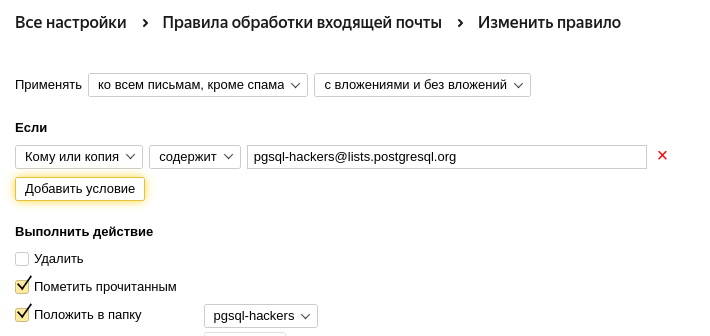 Как только подписка выполнена, можно отправлять письмо со своим вопросом на адрес рассылки (например, pgsql-hackers@lists.postgresql.org). Отправлять письмо лучше из программы почтового клиента, например, Thunderbird (инструкция по интеграции с почтой Яндекса https://yandex.ru/support/yandex-360/customers/mail/ru/mail-clients/mozilla-thunderbird.html). При отправке через веб интерфейс Яндекса портится форматирование при просмотре письма в списке рассылок (можно решить отключением форматирования в веб-интерфейсе), а также в поле Message-ID добавляется приставка @mail.yandex.ru.