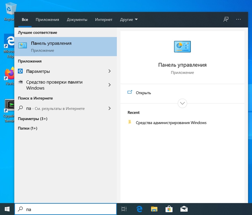 Запустить панель управления. Как вариант через клавишу Windows и поисковую строку