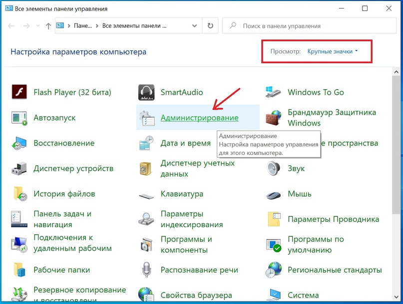 В режиме «Крупные значки» щелкнуть на «Администрирование»