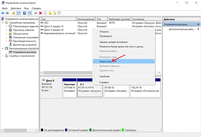 Правой кнопкой мышки вызвать контекстное меню на сжимаемом разделе. Выбрать пункт «Сжать том»