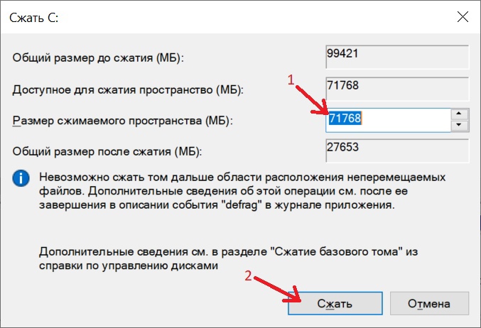 Указать размер освобождаемого дискового пространства. Нажать кнопку «Сжать»