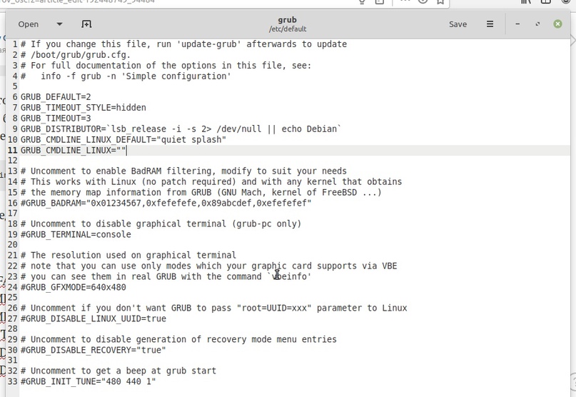 GRUB_DEFAULT=0 GRUB_TIMEOUT_STYLE=hidden GRUB_TIMEOUT=10 GRUB_DISTRIBUTOR=`lsb_release -i -s 2> /dev/null || echo Debian` GRUB_CMDLINE_LINUX_DEFAULT="quiet splash" GRUB_CMDLINE_LINUX="»