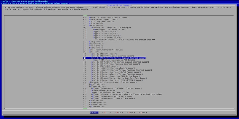 На этом этапе можно выбрать, какие модули ядра будут компилироваться и как: в виде отдельного файла *.ko или внутри самого ядра. В данном случае выделенный драйвер сетевой карты будет внутри ядра.