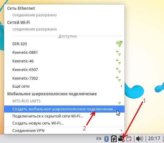 Подсоединить модем. Щелкнуть левой кнопкой по значку сети в трее. В открывшемся меню выбрать «Создать мобильное широкополосное подключение…»
