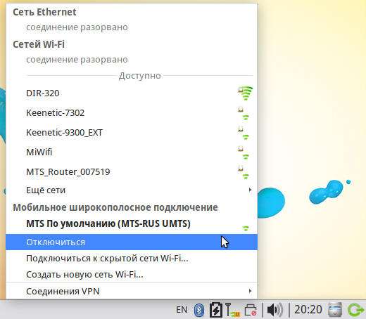 Для отключения в меню, вызываемом щелчком левой кнопки по иконке в трее, выбрать «Отключиться».