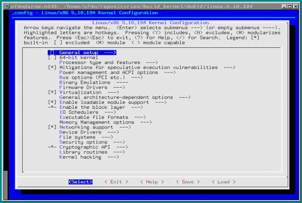 С её помощью вы можете вручную включить нужные модули прямо в ядро (нажать “y”), скомпилировать их отдельными файлами (“m”), вообще не компилировать (“n”), читать справку по каждому пункту (“?”), искать нужные пункты (“/”).