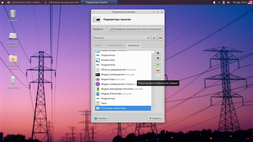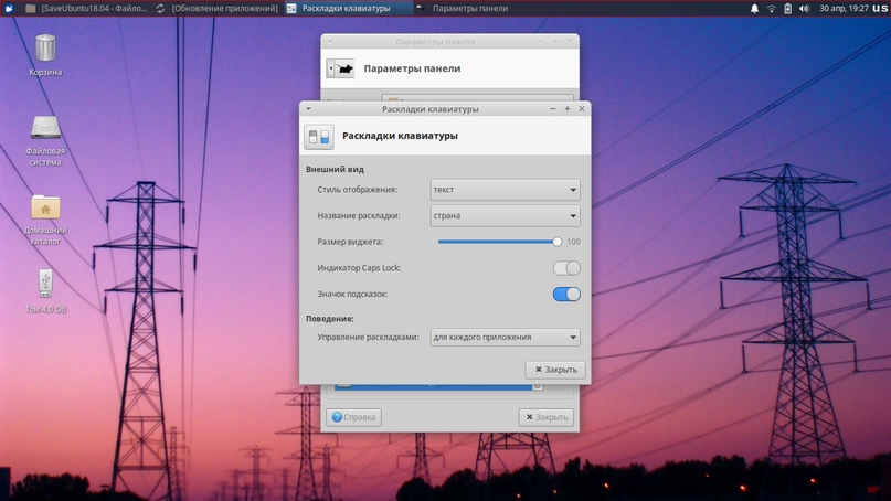 Есть проблема: на панели задач не отображается язык и не настроено их переключение. Зайдём в меню → Настройки → Клавиатура