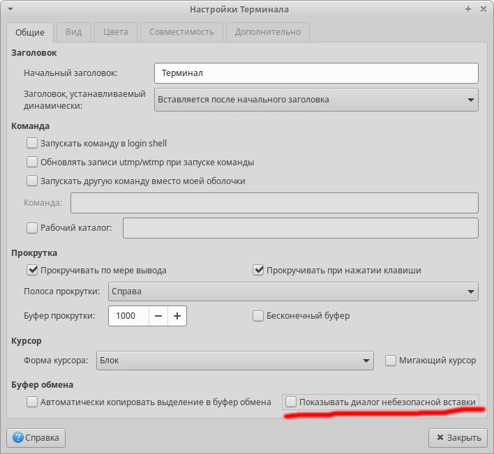 В терминале через меню Правка/Настройки вызвать окно, в котором снять флажок “Показывать диалог небезопасной вставки”