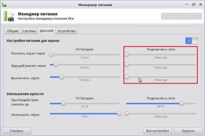 На вкладке «Дисплей» перевести выделенные ползунки в крайнее левое положение (Никогда).